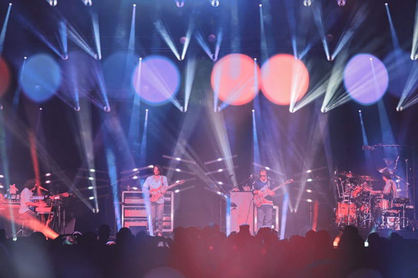 Goose’s current lineup consists of Rick Mitarotonda (vocals, guitar), Peter Anspach (vocals, keys, guitar), Trevor Weekz (bass) and Cotter Ellis (drums). Their website describes the music as a “deft union of indie-rock hooks, sprawling improvisation, and driving rhythm.” Personally, I liken it to a jazzier Phish sound if there is such a thing. Regardless your impression, improvisation takes center stage at a Goose show, as do the lights which makes the whole live experience a feast for the ears and eyes. Lighting Designer, Andrew Goedde, and programmer, Tony Caporale, have been with the band since the early days delivering the perfect live accompaniment to the often lengthy jams on stage. Like Phish’s Chris Kuroda, fans often refer to Goedde as an extended member of the band.
